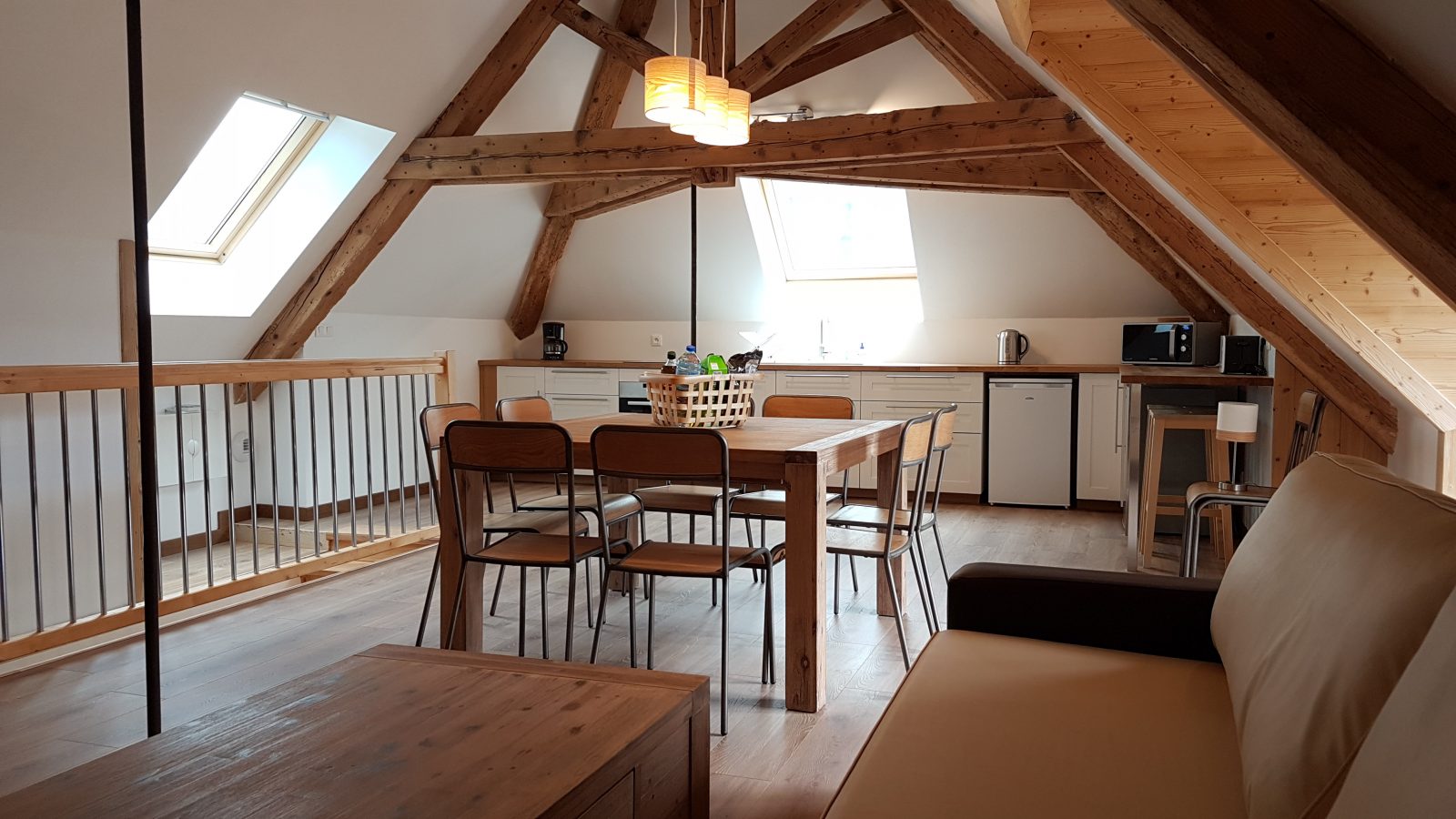 De zolder, omgebouwd tot een ruime woonkamer met zichtbare balken, beschikt over een grote keuken en een woon / eetkamer met een prachtig uitzicht op de omliggende bergen.